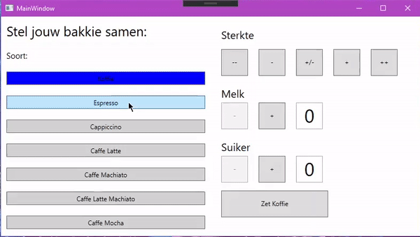 This is an app I made to remake the userinterface of a coffee machine. You can choose what kind of coffee you want, how strong it should be, how much milk you want and how much sugar you want in your coffee. When you press make coffee it shows you what you chose. This was one of my first WPF applications.