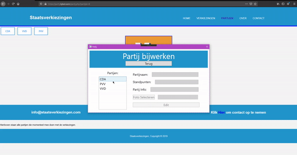 This is an application I made to create database connections. With that connection you can change the data inside the database. When you change somehting in the database it will automatically update it for the website and admin panel. You can add, remove and edit an party. You also can contact the website with a form. When that form is filled in the admin can go to the contact page inside the app and see all the contact information.